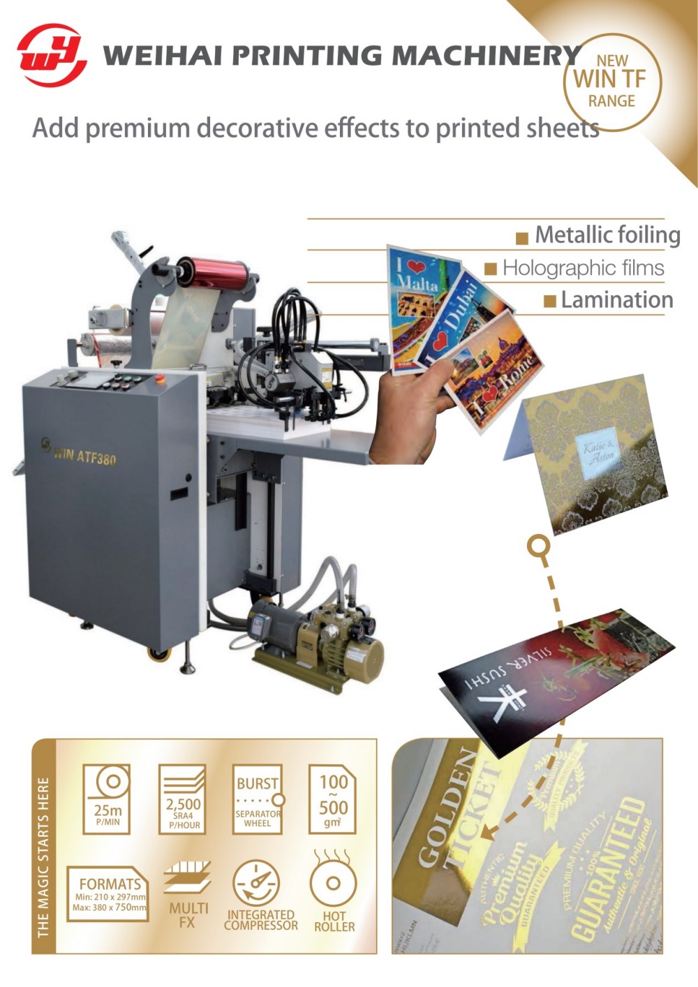 Die 380-mm-Bogenlaminier- und Folienpresse von Weihai Printing Machinery Co., Ltd. hat ein kompaktes Design und verfügt über vollautomatische Laminier- und Heißprägefunktionen. Es wird hauptsächlich für Digitaldrucke verwendet und kann auch Offsetdrucke automatisch laminieren und heißprägen und so gewöhnliche Druckmaterialien in exquisite Produkte verwandeln. Es hält sich an strenge technische Standards und regelt Druck und Heiztemperatur während der Produktion automatisch, um unterschiedliche Druckanforderungen zu erfüllen und die besten Ergebnisse zu erzielen. Dies ist eine hervorragende All-in-One-Maschine zum automatischen plattenlosen Laminieren und Folieren. Die Anlage ist einfach zu bedienen und vollständig automatisiert. Sie ermöglicht die Auswahl verschiedener Laminierspezifikationen und Prägewalzen, wodurch sie für verschiedene Druckgrößen geeignet ist und den Druckmaterialien einen zusätzlichen Mehrwert verleiht.