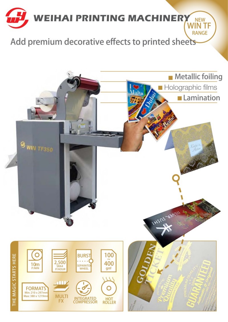 WIN bietet eine professionelle Laminier- und Folienmaschine (TF350/ATF380), auch plattenherstellungsfreie Laminier- und Folienmaschine genannt, die sich nahtlos mit der Digitaldruckmaschine und der digitalen Bogendruckmaschine verbindet. Diese hocheffiziente Weiterverarbeitungsanlage integriert Laminier-, Heißpräge- und Kaltfolienfunktionen. Es kann Glanz-, Matt- und Laserfolien aufbringen sowie präzise Metallfolienprägungen in einem Durchgang durchführen. Mit präziser Temperatur- und Druckregelung sorgt diese Laminier- und Folienmaschine für blasenfreie, verzugsfreie und feste Prägeeffekte. Es unterstützt die automatische Papierzufuhr, den stabilen Transport und die hochpräzise Registrierung und verbessert so das Erscheinungsbild und den Mehrwert von Druckprodukten erheblich. Diese langlebige und einfach zu bedienende Laminier- und Folienmaschine wird häufig für hochwertige Visitenkarten, Geschenkboxen, Zertifikate, Buchumschläge und hochwertige Werbematerialien verwendet.