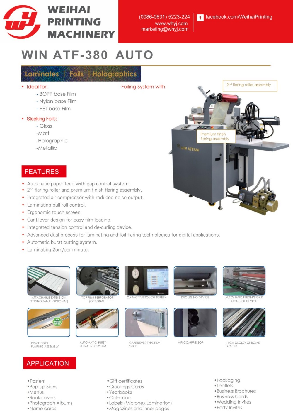 Die von Weihai Printing Machinery Co., Ltd. entwickelte und hergestellte plattenherstellungsfreie Laminier- und Folienmaschine ist eine manuelle Laminier- und Metallfolienmaschine mit Papierzuführung. Sein kompaktes Design spart Platz und bietet sowohl Laminier- als auch Metallfolienfunktionen – ideal für Unternehmen, die im eigenen Haus dekorative Akzente setzen möchten. Es verwandelt gewöhnliche Druckmaterialien in exquisite Endprodukte und arbeitet nahtlos sowohl mit digitalen On-Demand-Anwendungen als auch mit herkömmlichen lithografischen Offsetdrucken zusammen. Um bestmögliche Ergebnisse zu erzielen, ist es mit einem elektronischen Steuergerät ausgestattet, das den Walzendruck und die Heiztemperatur während des Betriebs anpasst. Diese Anpassungen basieren auf Faktoren wie Laufgeschwindigkeit, Papierstärke und Designmustern. Diese Maschine hat sich als erstklassiges Heißpräge- und Laminiergerät ohne Plattenherstellung erwiesen und hilft Kunden dabei, ihren Produkten einen erheblichen Mehrwert zu verleihen. Darüber hinaus steht den Kunden eine große Auswahl an Laminierfolien und Metallfolien zur Verfügung, um alle dekorativen Wünsche zu erfüllen. Darüber hinaus verfügt es über einen verlängerten Papiereinzugstisch, der sich perfekt für Banner und überlange Druckmaterialien eignet.